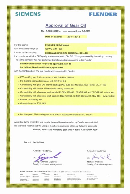 我公司的全合成PAO風力發電專用齒輪油已于2009年10月14日正式獲得德國西門子-弗蘭德公司的認證,今日我司接到了弗蘭德公司的正式通知。弗蘭德是全球最權威的風力發電機變速箱制造商。我司是國內第一家獲此認證的潤滑油公司!