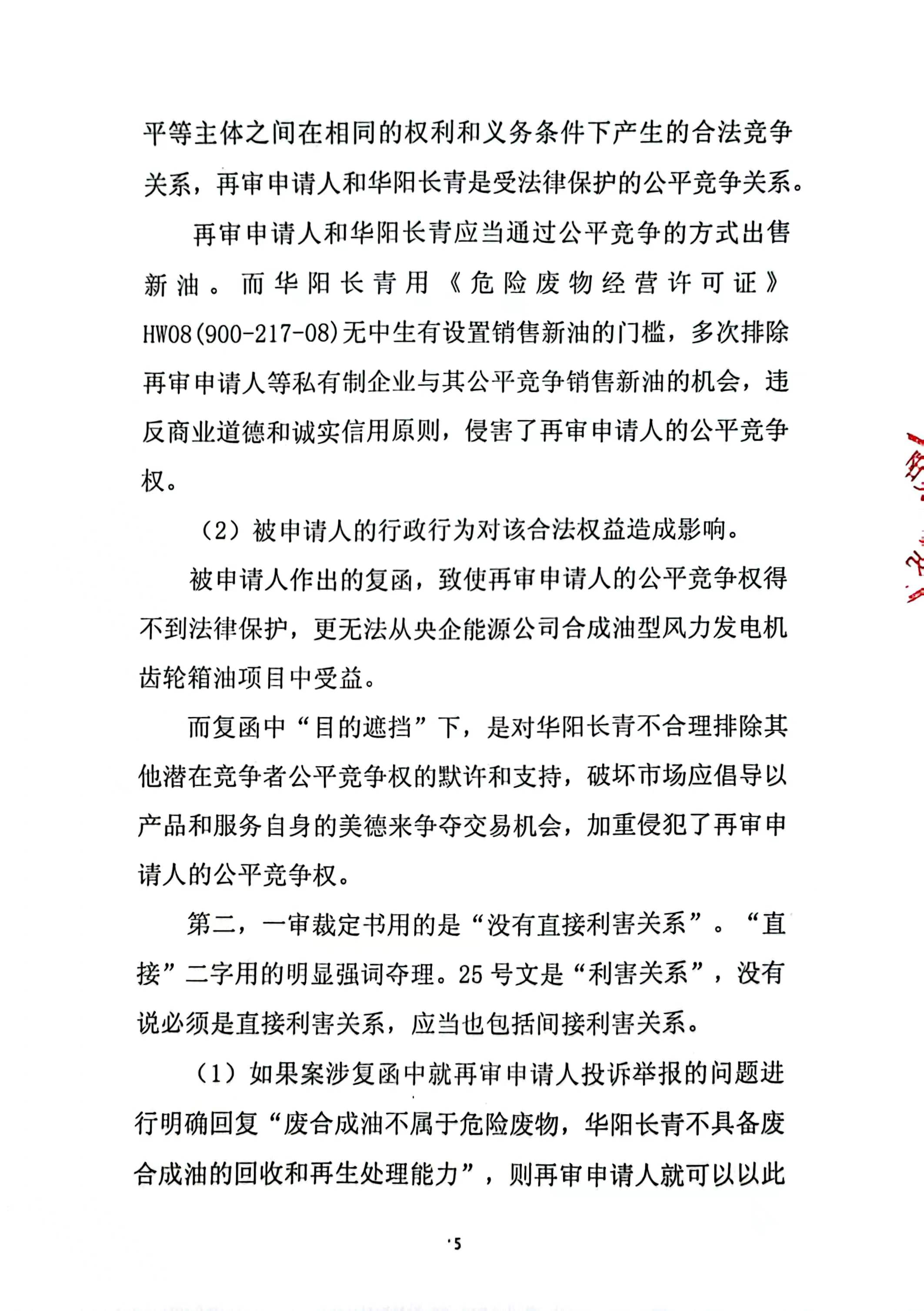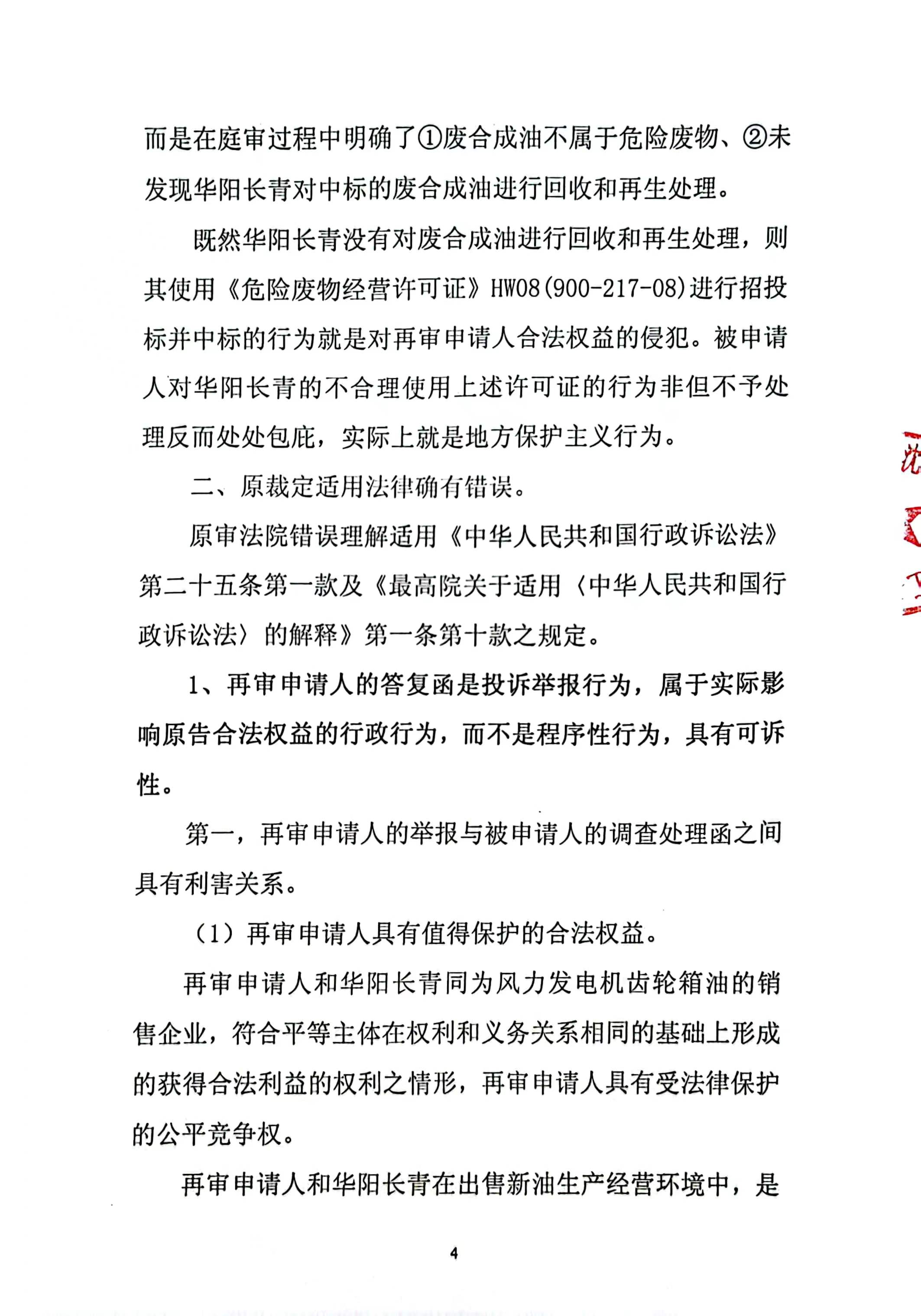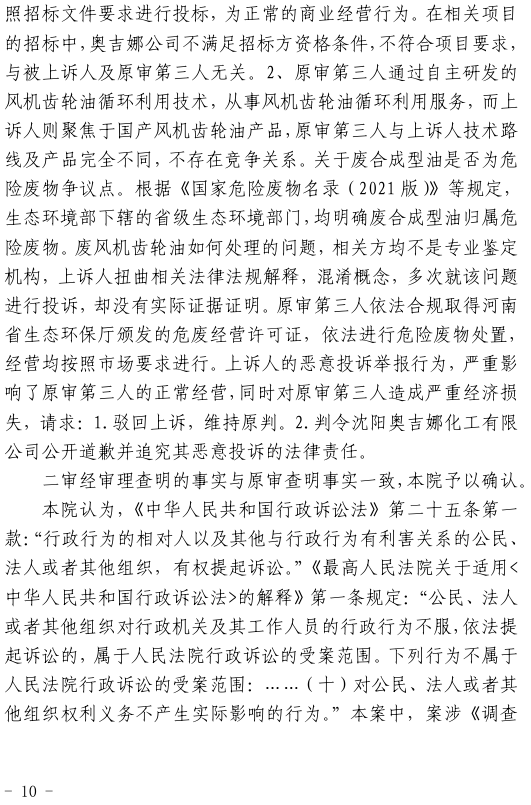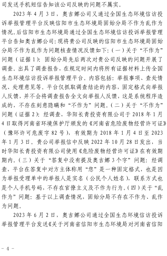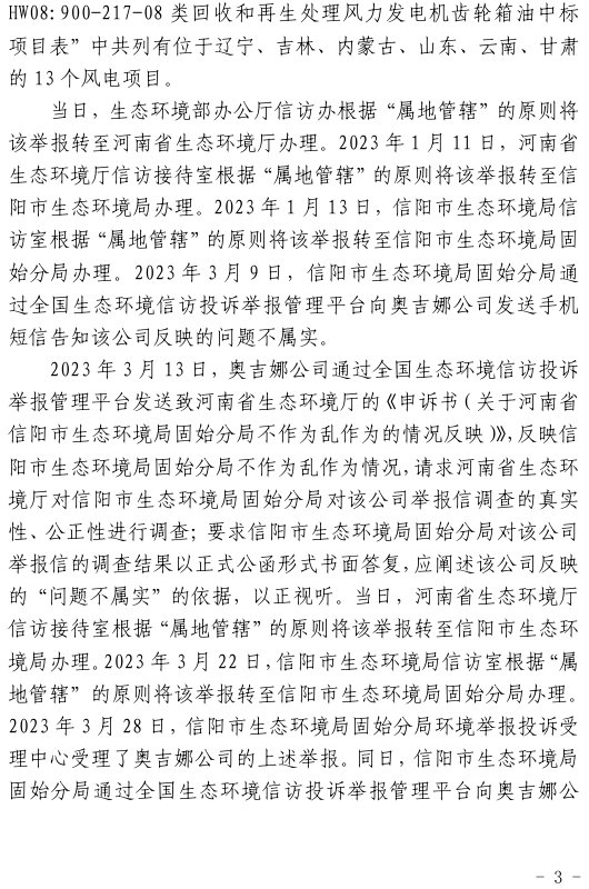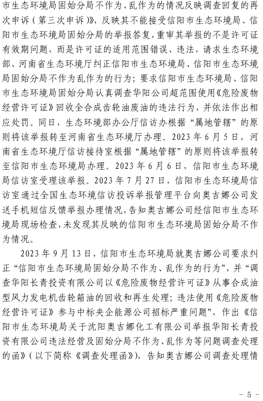 2023年3月9日,奧吉娜公司收到固始分局通過12369環(huán)境信訪平臺(tái)的短信答復(fù):“反映問題不屬實(shí)”。3月10日,奧吉娜公司向固始分局負(fù)責(zé)人電話詢問,其解釋稱:經(jīng)調(diào)查核實(shí),華陽長青公司沒有再生風(fēng)電潤滑油銷售,出售的是新油。否定了奧吉娜公司的舉報(bào)內(nèi)容。對(duì)此,奧吉娜公司表示強(qiáng)烈不滿。3月11日,奧吉娜公司向環(huán)境部投訴固始分局的不作為和亂作為。2023年5月26日,奧吉娜公司收到12369環(huán)境信訪平臺(tái)的短信答復(fù)。答復(fù)部門為信陽環(huán)境局。令人啼笑皆非的是,答復(fù)稱,華陽長青的許可證有效期沒有問題,與舉報(bào)內(nèi)容風(fēng)馬牛不相及。2023年6月13日,奧吉娜公司再次向環(huán)境部提出申訴,指出,奧吉娜舉報(bào)的不是許可證有效期問題,而是許可證的適用范圍錯(cuò)誤、違法。2023年7月27日,奧吉娜公司收到回復(fù)稱,經(jīng)信陽市生態(tài)環(huán)境局現(xiàn)場檢查,未發(fā)現(xiàn)固始分局不作為情況。2023年8月3日,奧吉娜公司向河南省生態(tài)環(huán)境廳(以下稱:環(huán)境廳)舉報(bào)信陽環(huán)境局包庇固始分局的行為。環(huán)境廳對(duì)此高度重視,有關(guān)處長和奧吉娜公司負(fù)責(zé)人進(jìn)行了面談。2023年9月13日,信陽環(huán)境局向奧吉娜公司致《信陽市生態(tài)環(huán)境局關(guān)于沈陽奧吉娜化工有限公司舉報(bào)華陽長青投資有限公司違法經(jīng)營及固始分局不作為、亂作為等問題調(diào)查處理的函》。函中:一是,以“齒輪箱”替換“齒輪箱油”,偷換概念;二是,做出了廢風(fēng)電合成(齒輪)油不屬于危險(xiǎn)廢物的結(jié)論;三是,未發(fā)現(xiàn)固始分局存在不作為、亂作為的不當(dāng)行為。再次否定奧吉娜公司的舉報(bào)和投訴。