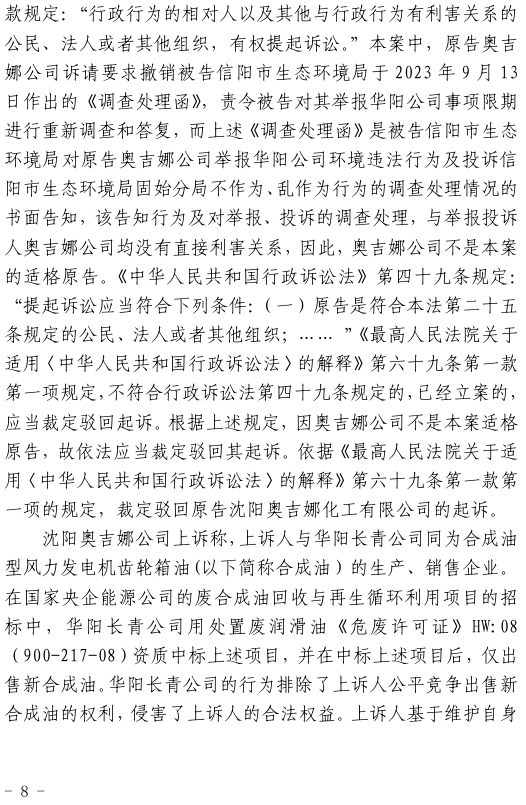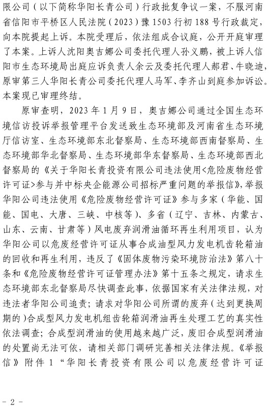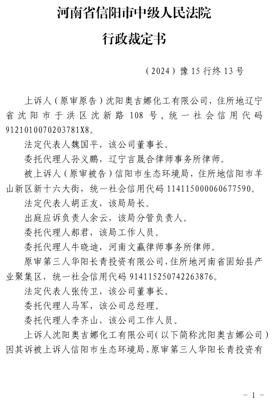 中國風(fēng)電潤滑油民營企業(yè)沈陽奧吉娜化工有限公司(下簡稱:奧吉娜公司或上訴人)訴信陽市生態(tài)環(huán)境局(被上訴人)和第三人華陽長青投資有限公司(下簡稱:華陽長青公司)行政訴訟案,河南省信陽市中級(jí)人民法院于2024年4月2日作出二審行政裁定:駁回上訴,維護(hù)原裁定。